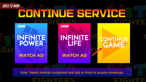 4、對局結束后可選擇【CONTINUE-GAME】繼續(xù)游戲,也能看廣告獲取【INFINITE-POWER】等增益。