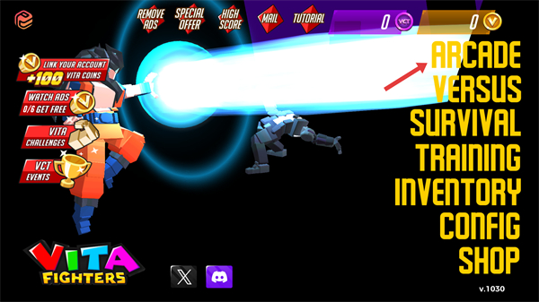 1、打開【VITA-FIGHTERS】游戲,點擊【ARCADE】模式開啟對戰(zhàn)。