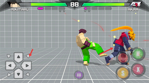 2、進入對局后,操控方向鍵移動角色【RIKIMARU】,點擊右側攻擊鍵對【AKIRA】發(fā)起進攻。